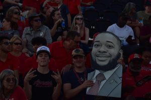 Friends of Nicholls 2024 Homecoming King Lance Jones holding up a cardboard cut out of Jones