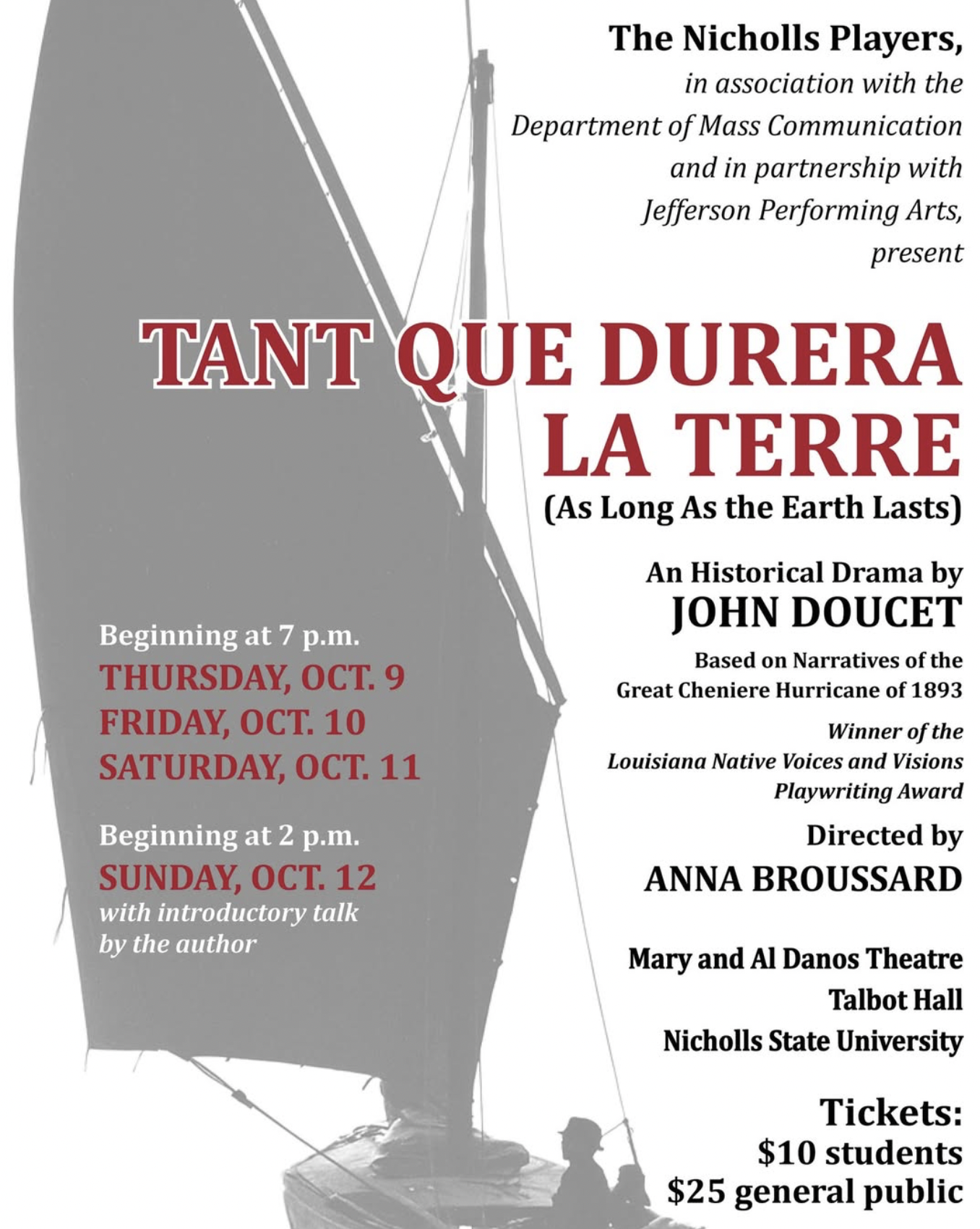 The Nicholls Players will bring one of Louisiana’s deadliest storms to the stage with Tant que durera la terre (As Long as the Earth Lasts), opening Oct. 9 in Talbot Theater.